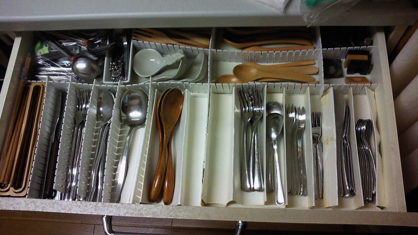 で、始めたのは、食器棚のカトラリーのところ。(カトラリーってフォークナイフスプ~ンであってる?)