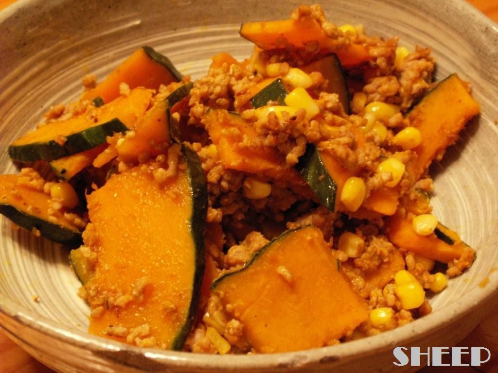 かぼちゃ、コーンを加え、かぼちゃに火が通ったらカレー粉と塩コショウ、荒挽きコショウをふって全体になじませ完成です。先にかぼちゃをチンしたほうが、調理しやすいかも。