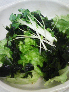 真似てみようと思ったら、このわかめではない海草が苦手。しかも、冷蔵庫にあったはずのトマトがなく、なんだか寂しいサラダに・・・。