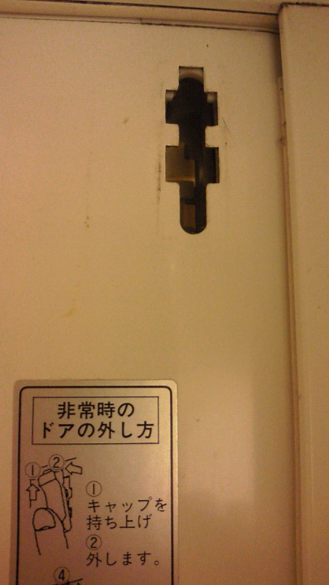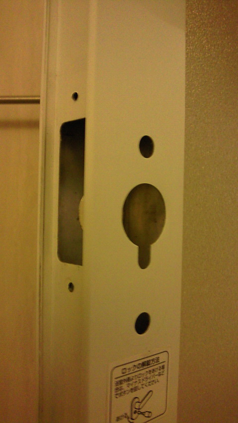 プラスティックの部品をはずして、さかさまに入れなおし、下に下げると、穴から見えているピンがさがってドアが外れる